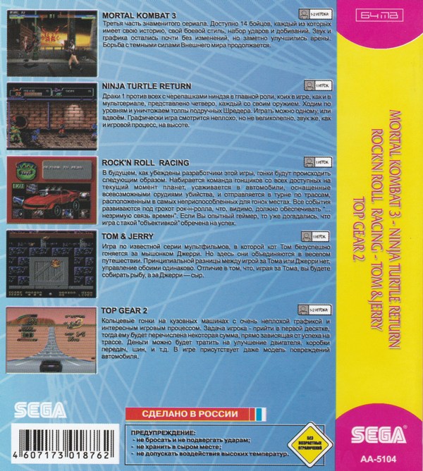 Картридж SEGA сборник 5 в 1 (AA-5104) Mortal Kombat, черепашки, гонки и мультяшки